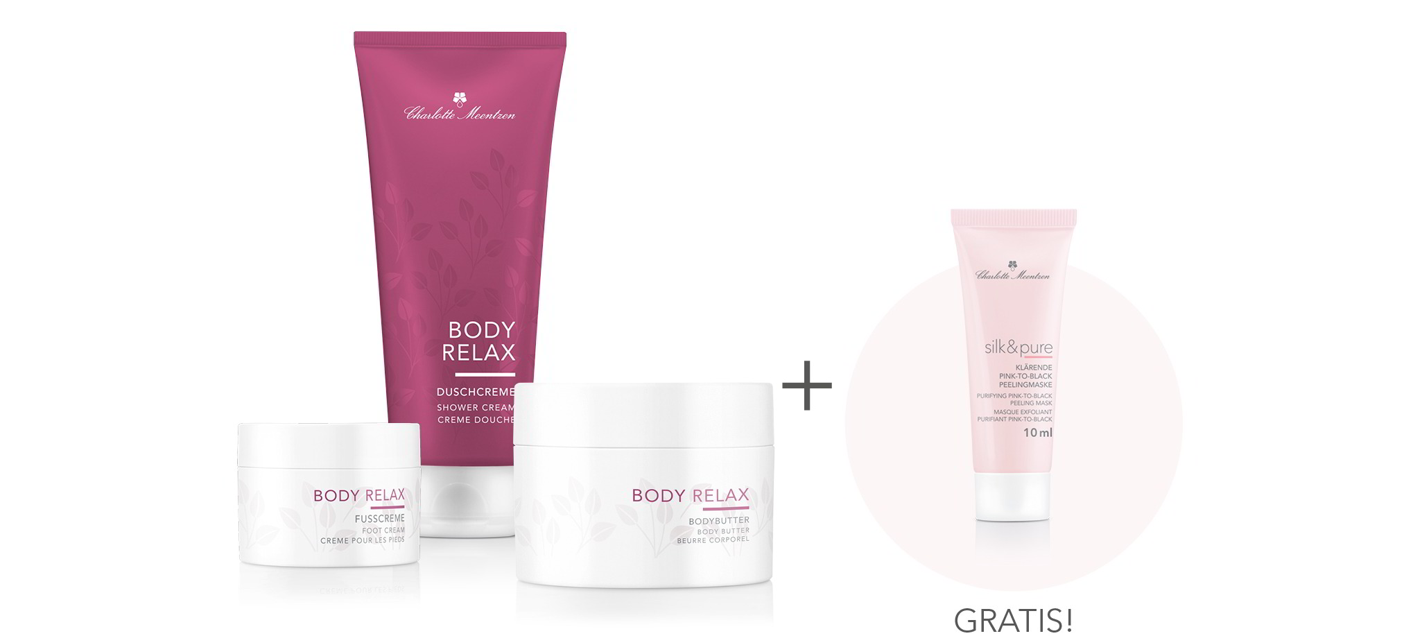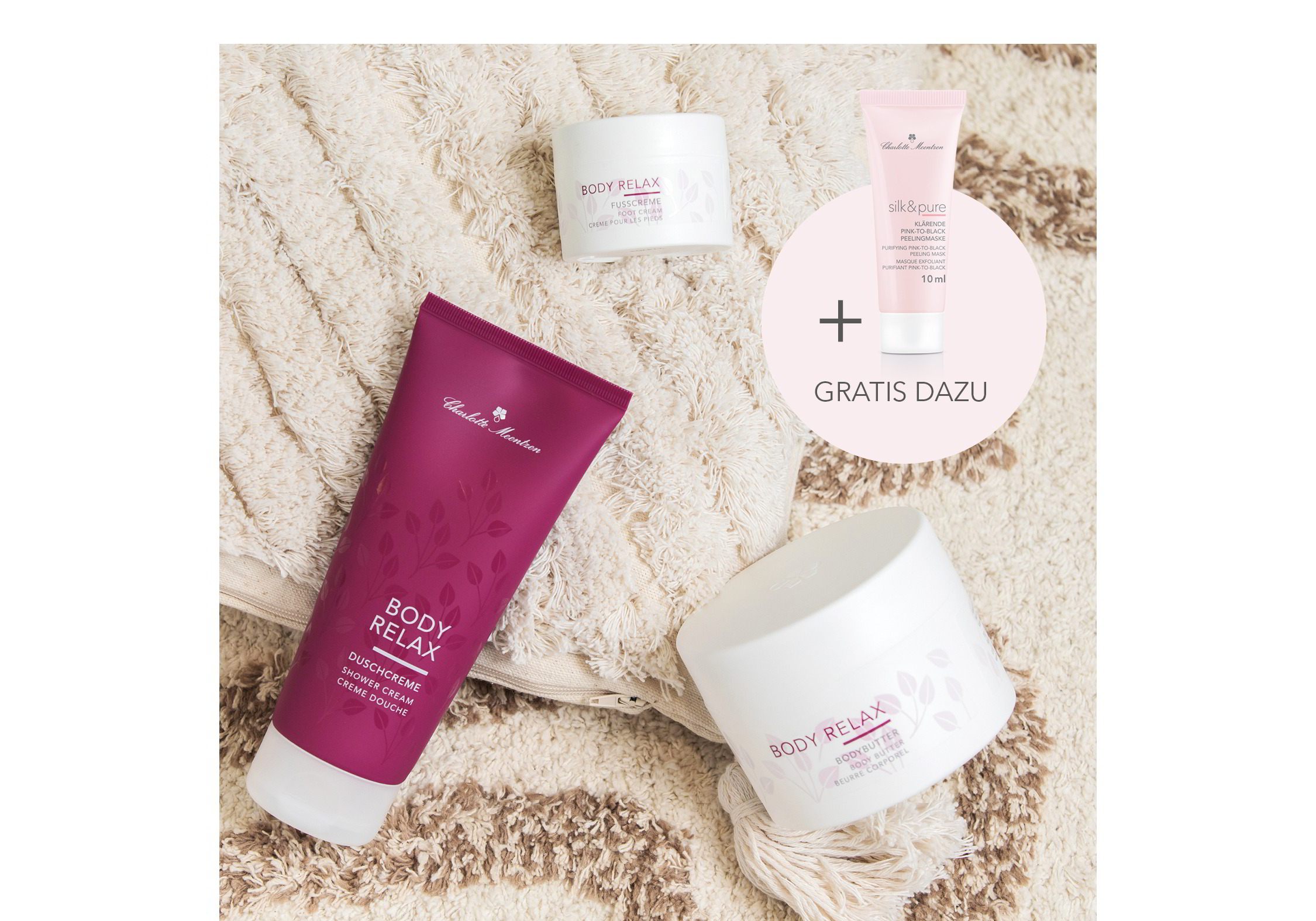 Mit dem BODY RELAX Pflege-Trio schenkst du deiner Haut täglich kuschlige Momente – wie eine weiche Decke, die dich umhüllt. Mit diesem Bundle bekommst du eine Sondergröße der SILK & PURE Pink-to-Black Peelingmaske gratis dazu (nur solange der Vorrat reicht).